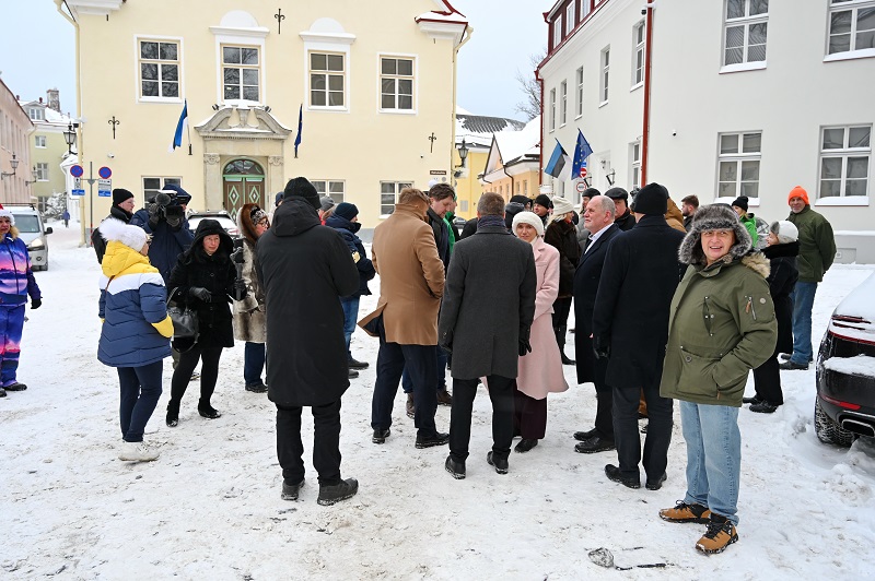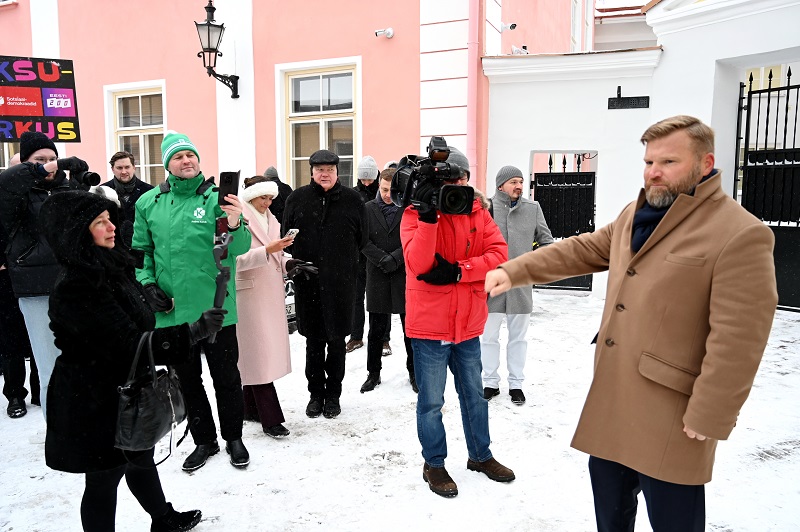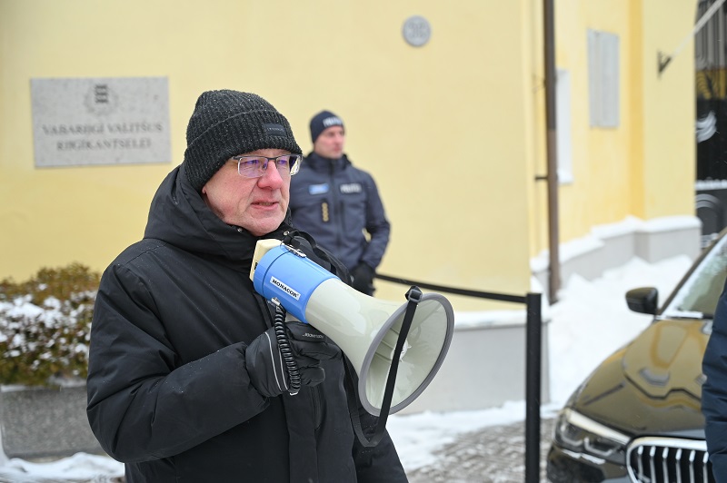 Вооружившись баннерами, пикетчики направились к Дому Стенбока. «Когда мы попадаем в кадр, надо делать вид, что нам радостно и совсем не холодно», — пошутил руководитель парламентской фракции центристов Лаури Лаатс. На улице был значительный минус.