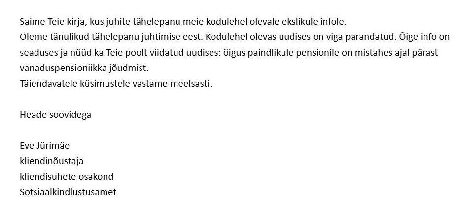 На сайте Департамента социального страхования была указана ошибочная информация о том, что выход на гибкую пенсию возможен либо за 5 лет до установленного пенсионного возраста, либо в течение пяти лет после наступления пенсионного возраста. В таком же виде эта информация была распространена большинством эстонских СМИ.