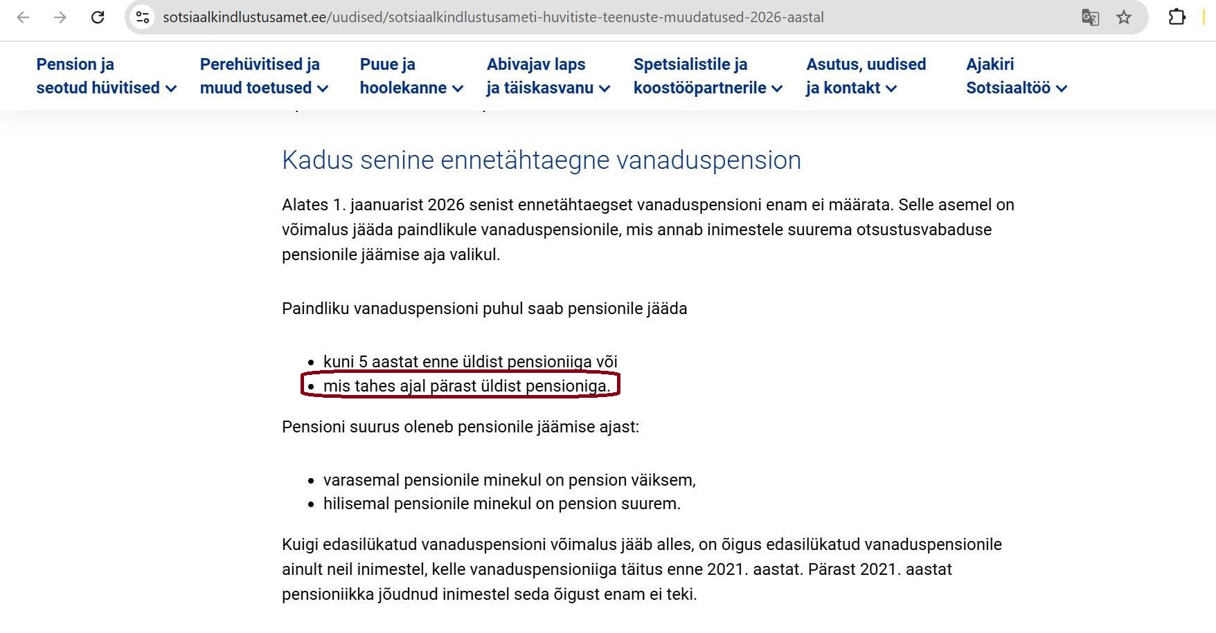 Как ранее писал портал Tribuna.ee, c января 2026 года прежняя досрочная пенсия по старости больше не назначается. Вместо неё предусмотрена возможность выхода на гибкую пенсию по старости, которая даёт людям большую свободу выбора времени выхода на пенсию. В рамках гибкой пенсии по старости на пенсию можно выйти за 5 лет до установленного пенсионного возраста или в любое время после достижения пенсионного возраста.