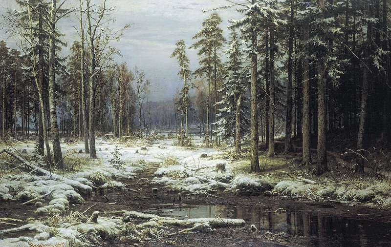 Третье своё дело завершает осень: раздев лес, сковав воду, прикрывает землю снежным покрывалом. Неуютно в лесу: исхлёстанные дождями, голые, чёрные стоят деревья. Блестит лёд на реке, ‒ а поди сунься на него: треснет под ногой, и ты провалишься в ледяную воду. И на земле присыпанная снегом всякая зябь останавливается в росте.