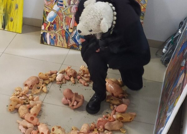 Последняя экспозиция, которая проходила в галерее Виктора Виноградова в самом центре Одессы, называлась «Куклопокалипсис 2025-2!!!» На ней было представлено 108 моих арт-объектов и ещё несколько художников, таких как Елена Кутинова и Кирилл Куленко. Почему «2»? Эта выставка уже переехала из предыдущего арт-пространства, где на наше шумное художественно-музыкальное сообщество возникли жалобы, и мы там продержались всего два дня, а на третий выехали, что обеспечило нам определённый резонанс и популярность как запрещённых художников, чему мы, конечно же, возрадовались. В галерее Виктора Виноградова мы тоже развели такую активную музыкально-акционно-перформативную жизнь, что сначала нам запретили проводить там концерты, литературные вечера и вечера электронной музыки, потом вообще снимать это всё на видео. В итоге нашу выставку закрыли через месяц, хотя, если бы мы там ничего не делали и вели бы себя там тихонечко, нам бы продлили условия пребывания.