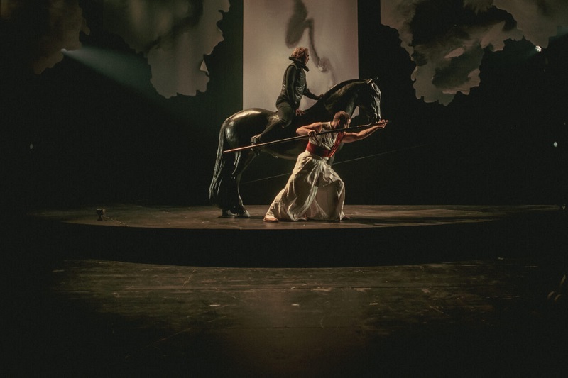 Гамлет (Урсель Тильк) и Горацио (Мяртен Метсавийр) сейчас умчатся на лошади. Фото: Gabriela Järvet (Eesti Draamateater)