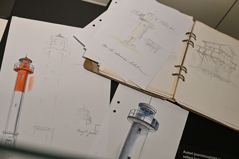 Главный экспонат в единственной витрине на выставке — блокнот художника, в котором он делал свои зарисовки, добираясь до места. Рядом — открытка, напоминающая о первой небольшой выставке марок с маяками Романа Маткевича, которая прошла в Музее почты в Тарту более 20 лет назад. Сегодня музея нет, его коллекция передана в Эстонский национальный музей, где марки Романа тоже выставлены.