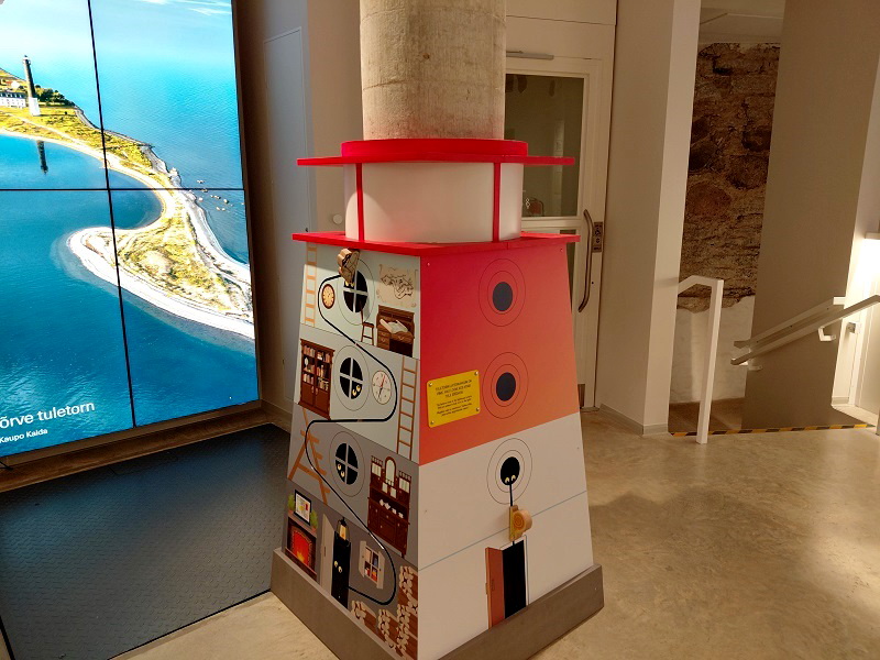 Роман Маткевич подвёл к макету маяка, созданному специально для детей. Он не пугает своим строгим видом, с ним можно играть. Образцом для выставочного экспоната послужил маяк Виртсу, конструкция которого представляет собой усечённую пирамиду. На каждой стороне макета внизу можно видеть игрушечного зверька — улитку, мышь и ежа, названного «Животным 2026 года» в Эстонии. Дети должны выбрать верный персонаж и помочь подняться ему до самого верха, тогда маяк зажжётся.