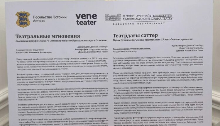 В начале марта в фойе Русского драматического театра им. М. Горького в столице Казахстана Астане состоялось открытие фотовыставки «Театральные мгновения», посвящённой 75-летию Русского театра Эстонии, которое отмечалось в прошлом году.