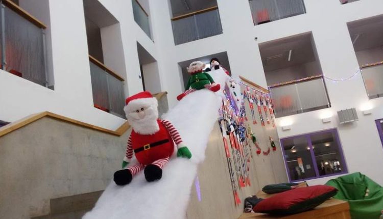 Просторное фойе и современный атриум здания под номером 13 на Таллиннском шоссе и стали тем самым Рождественским городком, гостей встречали знаменитые мелодии, давно ставшие легендарными, а симпатичные герои зимних праздников — Санта-Клаус, Эльф и Снеговики, несущиеся по перилам лестницы, словно с горки, — дарили свой задор и заряжали хорошим настроением.