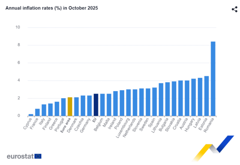 Самые низкие годовые показатели были зарегистрированы на Кипре (0,2%), во Франции (0,8%) и в Италии (1,3%). Самые высокие отмечены в Румынии (8,4%), Эстонии (4,5%) и Латвии (4,3%). По сравнению с сентябрем 2025 года годовая инфляция снизилась в пятнадцати государствах-членах, осталась стабильной в трёх и выросла в девяти.