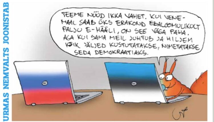 «Очень хорошая карикатура. Господин Немвальтс сумел одновременно сыронизировать над двумя находящимися в комнате слонами. Во-первых, недопустимости поставить под сомнение электронные выборы в Эстонии. Э-выборы — это хорошо, а тот, кто думает иначе, — ретроград и противник государства. Но, может быть, стоило бы обсудить рационально все вопросы? В свободном обществе должно быть право сомневаться и в нормальности“».