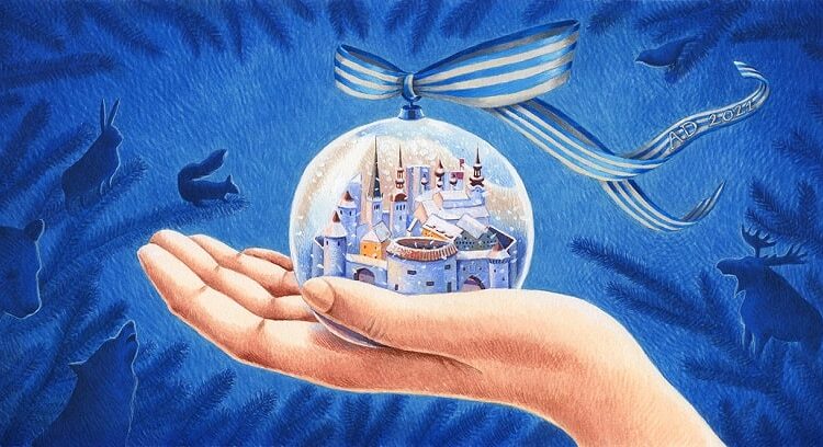«В довершение всего в ноябре мне на почту пришло приятное и удивительное письмо — предложение нарисовать рождественскую открытку для мэра Таллинна. Уже месяц спустя поздравления с Рождеством городского главы разлетелись по миру в тёмно-синих цветах зимы и цветах Таллинна вместе с маленькой сказкой в стеклянном шаре. Было честью визуализировать рождественское поздравление Таллинна, а стеклянный шарик с родным домом сопровождает и меня в моём пути», — сообщила Мяртенс.
