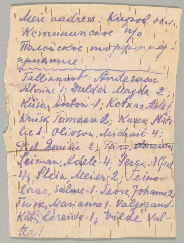 По словам члена правления Эстонского исторического музея Яануса Рохумаа, в коллекции музея есть берестяная тетрадь, содержащая эмоциональные тексты, поздравительные открытки, рисунки и письма 1941-1947 годов, каждое из которых раскрывает своего рода трагическую судьбу автора.