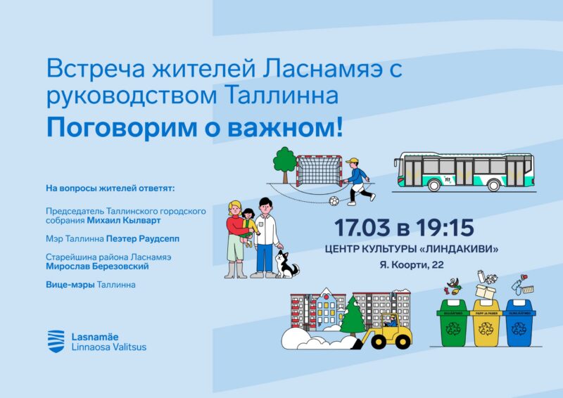 Во вторник, 17 марта, в центре культуры «Линдакиви» (ул. Я. Коорти, 22) состоится встреча с жителями Ласнамяэ, на которой вопросы развития города и района можно будет обсудить напрямую с руководством Таллинна и представителями управы. Встреча пройдёт в 18:00 на эстонском и в 19:15 на русском языках.