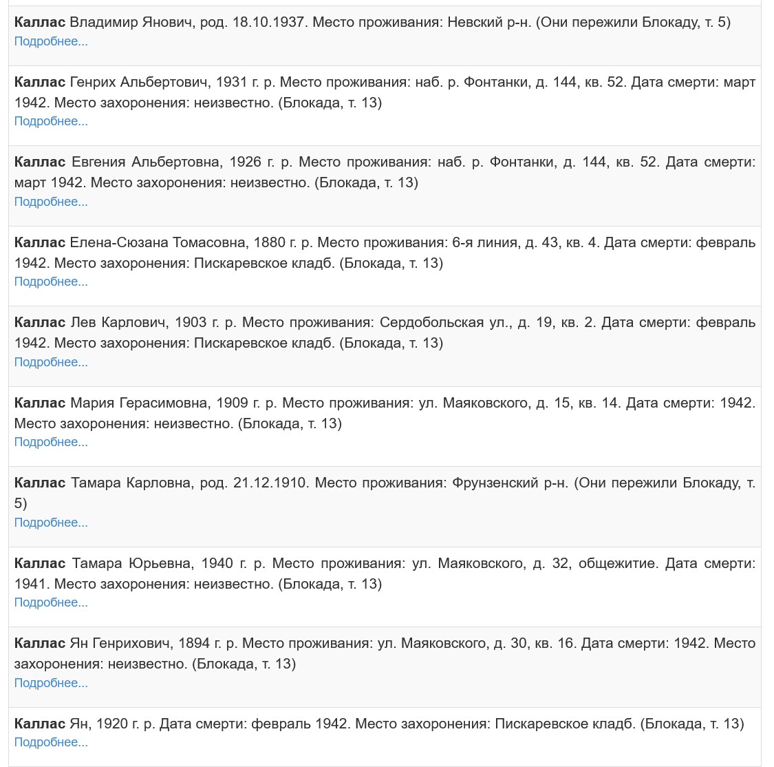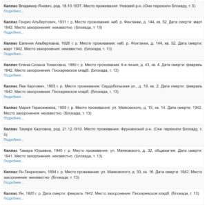 И ведь это не просто список фамилий. Например, из тех же 10 человек по фамилии Каллас, четверо – дети (один выживший). Из троих умерших детей двое – брат и сестра (судя по тому, что у них у них одинаковые отчества и домашний адрес), Генрих и Евгения, 1931 и 1926 г.р. Дата смерти у обоих – март 1942. Значит, некая семья Каллас за один месяц (а может, за одну неделю или за один день) потеряла сына и дочь, умерших, очевидно, от голода, которым было 10 или 11 и 15 или 16 лет. Много детей умерло в блокаду. Тысячи…