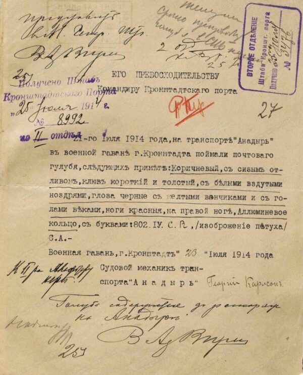 «21 июля 1914 г. на транспорте «Анадырь» в военной гавани г. Кронштадта поймали почтового голубя следующих примет: коричневый, с сизым отливом, клюв короткий и толстый, с белыми вздутыми ноздрями, глаза чёрные с жёлтыми венчиками и с голыми веками, ноги красные, на правой ноге алюминиевое кольцо с буквами: 802 IV C R /изображение петуха/ С.А.».
