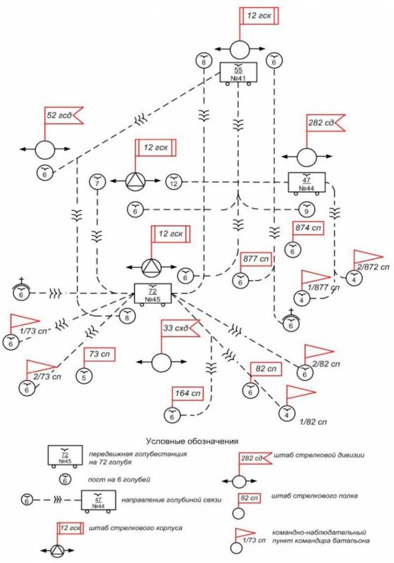 Схема организации двусторонней голубиной связи в боях при форсировании реки Великой 23-26 июня 1944 года. Источник: Минобороны РФ